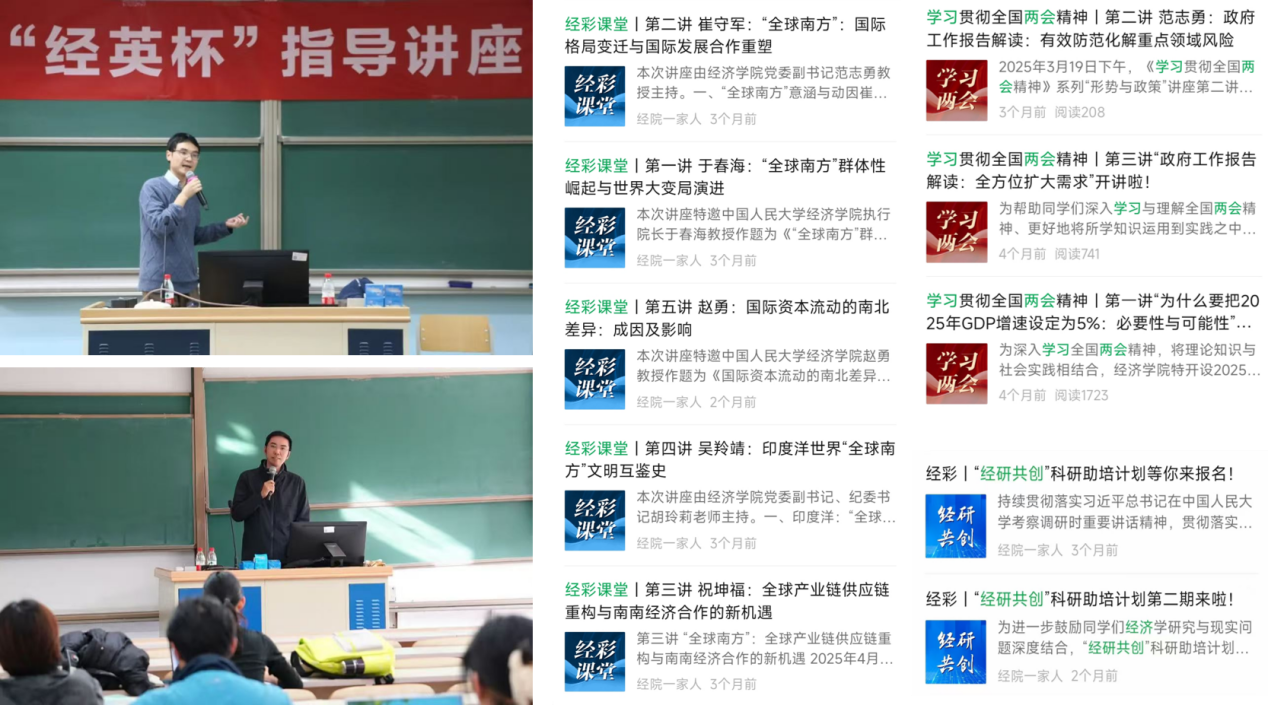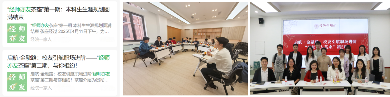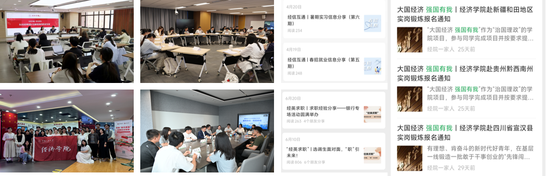关注学生所想,服务学生实事。针对学业发展,在课程学习方面,针对学业困难同学点对点提供帮助与支持;在本科生升学方面开展学业生涯规划指导活动和保研、考研、出国境升学交流沙龙,覆盖30余个主流升学项目;在硕士研究生升学方面,开展“申请考核制”博士经验分享讲座。针对职业发展,开展“经英导航”“经英求职”职业交流分享活动,结合学科特点和学生需求,以讲座、座谈、模拟面试、企业参访等形式分行业分类别开展职业指导活动;开展“强国有我”实岗见习活动,与地方政府、企业建立实习实践基地,目前开拓有四川宣汉、贵州黔西南、新疆和田三个基地,培养学生的问题意识。